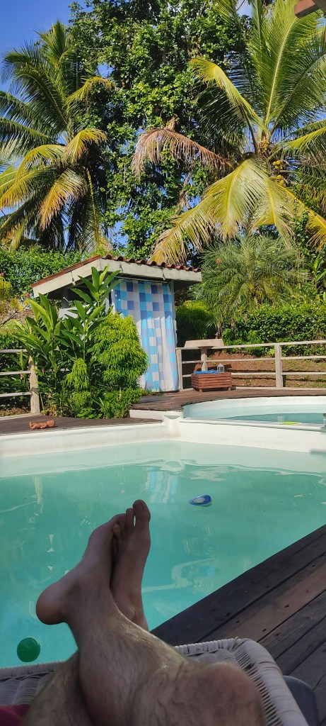 On passe donc l’après midi au bord de la piscine mais plus souvent dans l’eau à cause de la chaleur intense. Puis on discute un long moment avec Clarisse de son choix de venir ici ect. Elle a deux magnifiques filles avec son mari David, qui lui est né ici. Elle nous prépare ensuite le dîner et on se régale.